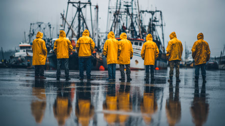 A team of anglers clad in vibrant yellow waterproofs assemble on a shimmering, rain-slicked pier, their silhouettes mirrored on the wet surface as moored vessels loo