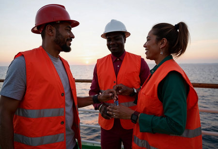 Diverse team of dock workers wearing hard hats and safety jackets, working at a shipping port