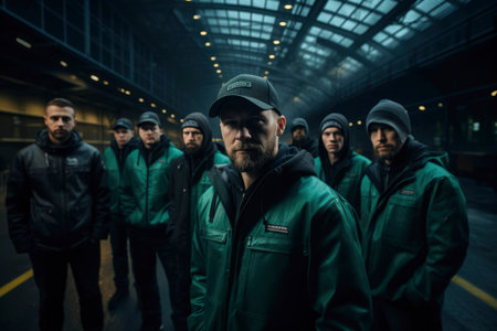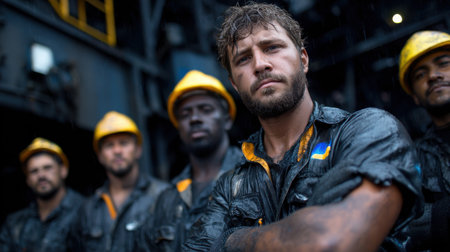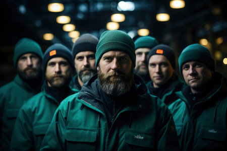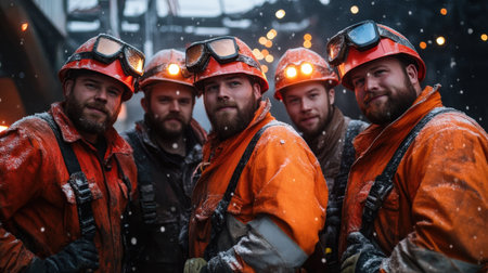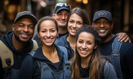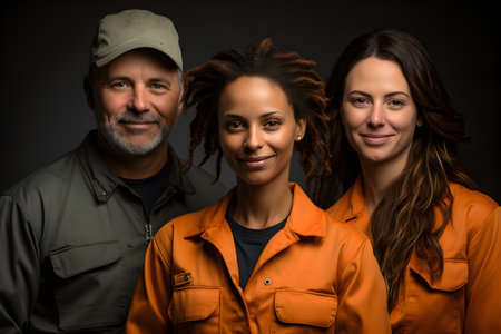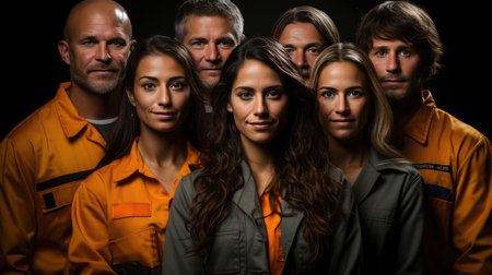 Portrait of a group of workers in a factory smiling and looking at the camera, group of smiling construction workers wearing uniforms, AI Generated