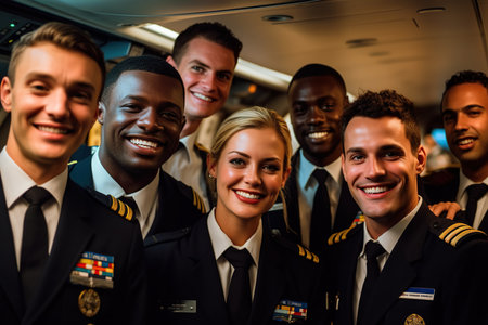 The pilots and crew of a modern airliner smile for a group photo, exuding confidence and professionalism. Generative AI.