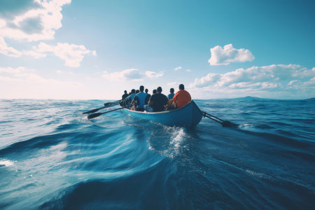 Rowers paddling a boat on the ocean on a sunny day, working together towards a common goal