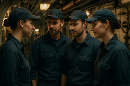 Diverse engineering team standing and discussing in a narrow, dimly lit industrial or mechanical environment