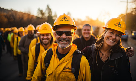 A diverse group of individuals wearing bright yellow hard hats for safety while working on a construction site.