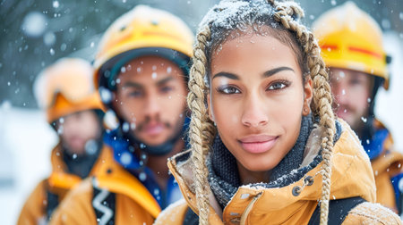 A group of firefighters stands attentively, wearing helmets and gear, ready to respond. The leader, with a focused expression, exemplifies teamwork and dedication in preparation for an emergency response drill.