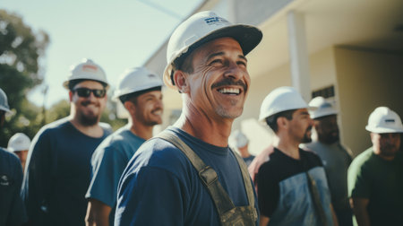 A group of cheerful construction workers smiles brightly during a sunny day on the job site.