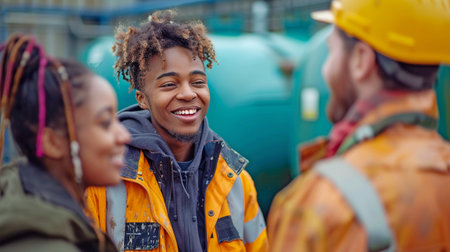 A diverse team of engineers and construction workers smiling together outdoors. Concept Outdoor Photoshoot, Teamwork, Diverse Group, Engineering, Construction Workers