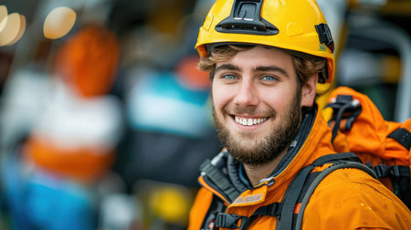 A worker with a thick beard and orange safety helmet smiles as he stands in a busy industrial environment filled with machinery and bright lights, showing a positive workplace atmosphere.