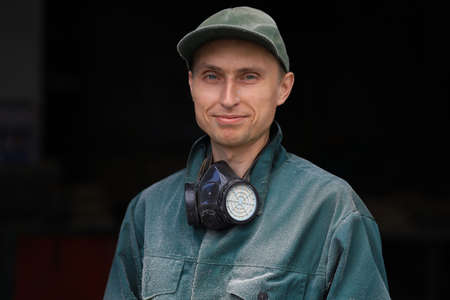 Portrait of a miner wearing a helmet, goggles and a undershirt with a dirty face