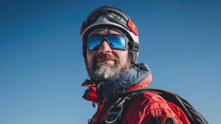 The picture of the professional skydiver wearing goggle doing skydiving in the sky under the bright light of the sun in the morning or noon and also wearing the parachute for safety landing. AIG43.