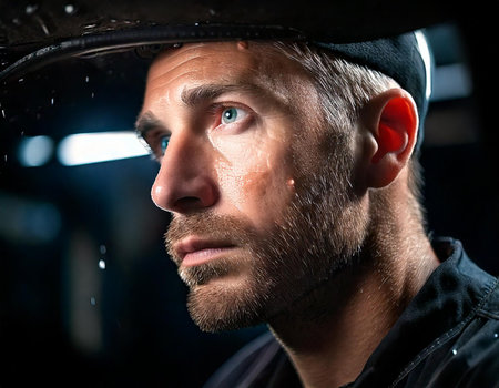 A seasoned professional in construction, wearing a safety helmet, gazes contemplatively into the shadows, illuminated by striking lighting that highlights his earnest expression.
