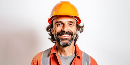 Happy male factory worker in uniform with helmet, representing industry, teamwork, and dedication.