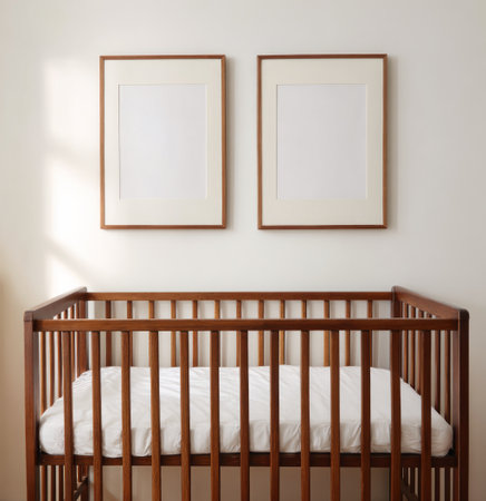 Baby crib with a white mattress, below two framed blank pictures on a white wall
