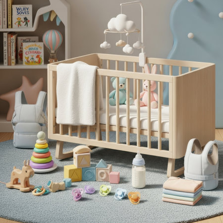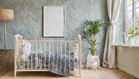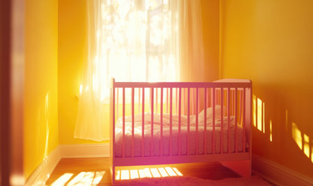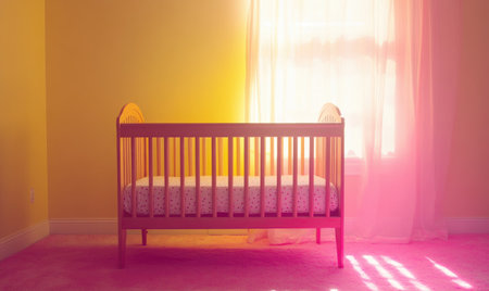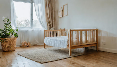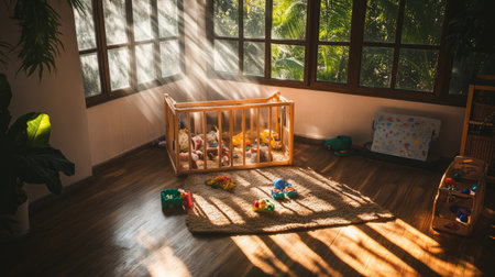 A serene nursery filled with soft natural light, featuring a wooden crib surrounded by colorful toys and vibrant plants, creating a nurturing space for children.
