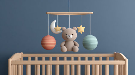 This charming nursery mobile features a cute bear, moon, and stars, designed to create a soothing atmosphere above a cozy crib for babies.