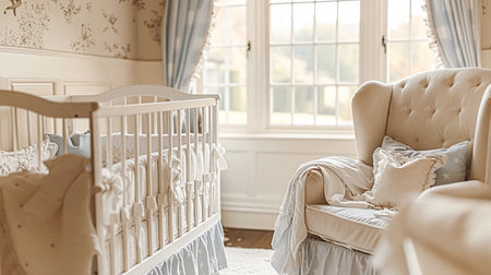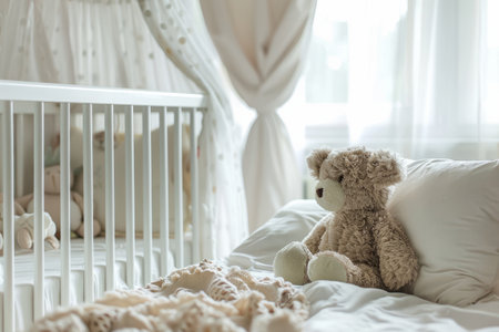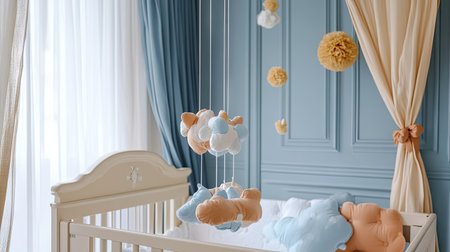 A serene nursery scene featuring a cozy crib adorned with plush toys and a colorful mobile. Perfect for capturing the essence of childhood comfort and joy.
