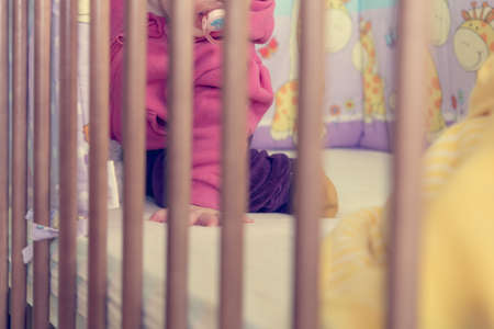Baby girl standing in her crib. Happy childhood concept