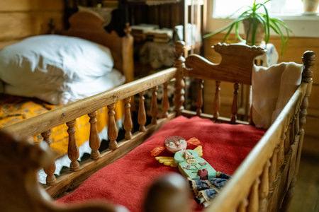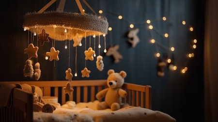 Handmade felt toys above the newborn crib with light AI generated illustration