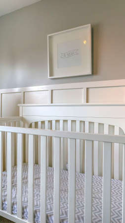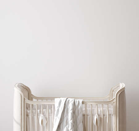 Crib against white wall in cozy modern nursery