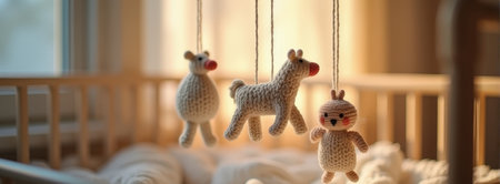 Cozy nursery with knitted animal mobiles in sunlit crib.