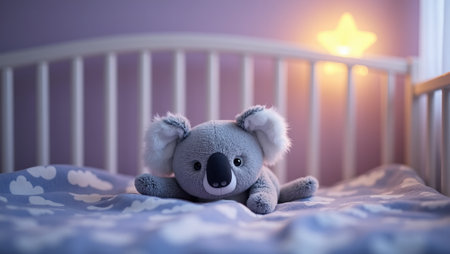 Adorable koala plush in crib with starry nightlight lavender walls