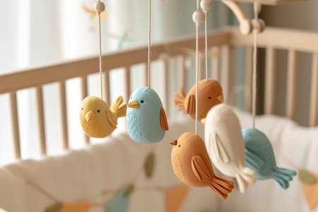 close-up of mobile hanging over crib with cute animals, created with generative ai