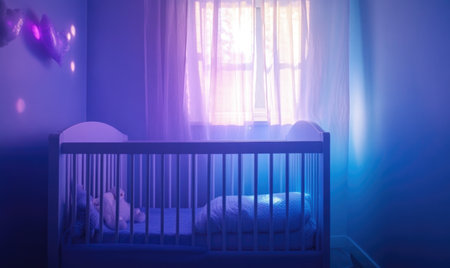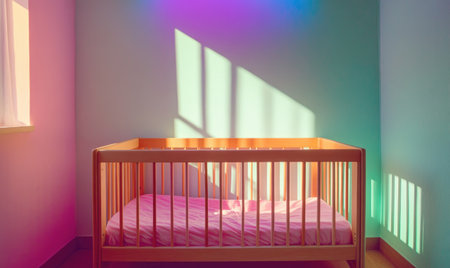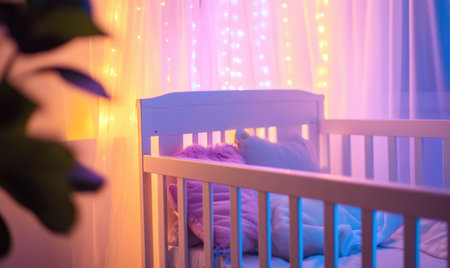 Wooden crib in a soft green nursery, glowing purple and pink lights