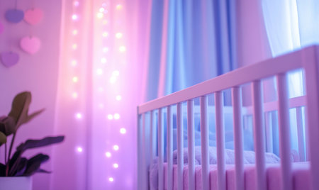 White crib in a nursery with lavender and pink decor, glowing purple and blue lights