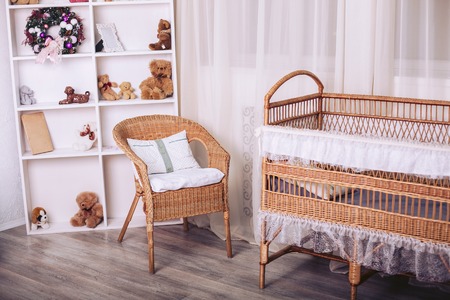 Rattan furniture in the children's bedroom with toys and New Year elements in gentle colors