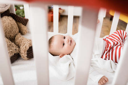 infant boy lying in baby crib on blurred foreground