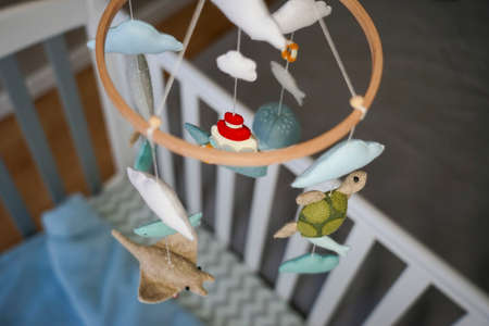 DIY craft baby crib mobile. Toys hang over the crib