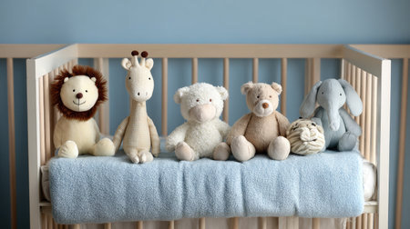 A charming scene featuring an inviting baby crib adorned with an array of plush toys including a lion, giraffe, bear, and more. Ideal for nursery themes.