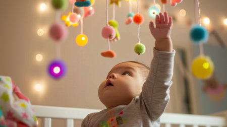 Infant reaching out with curiosity towards a colorful mobile hanging above their crib.