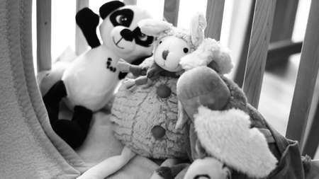 soft toys hanging over crib in nursery near window