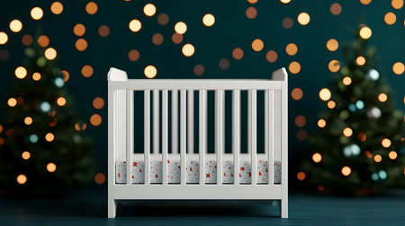 White baby cot in front of christmas tree. 3d rendering