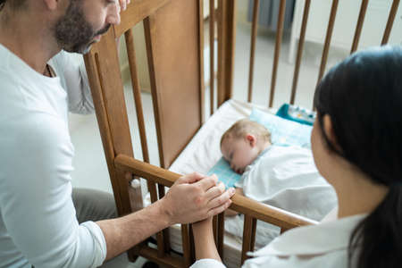 Caucasian parents take care of sleeping baby boy in bedroom at home. Attractive happy family couple, mother and father puts blanket on comforte asleep napping little kid child infant on bed in morning