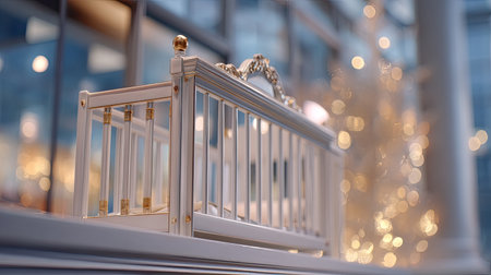 A luxurious baby crib featuring delicate golden accents, beautifully placed in a modern room with warm, inviting bokeh lights, enhancing the serene ambiance.