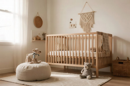 Sunlight illuminates cozy nursery with crib, stuffed animals, and minimalist decor creating warm and inviting atmosphere suitable for childs rest and playtime