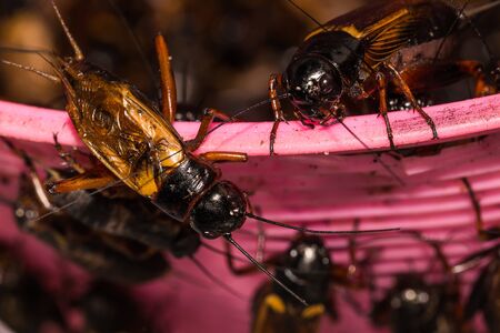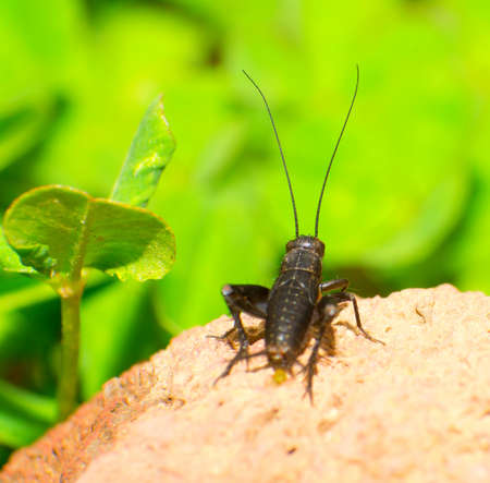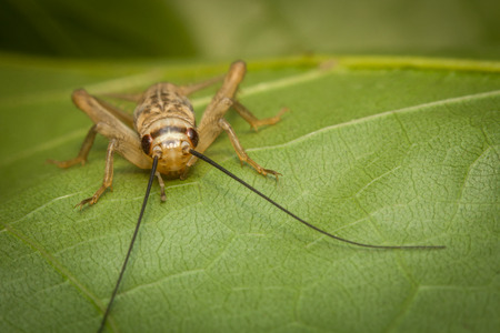 Close up house brown cricket insect or known as Acheta domestica in the green garden, perching on a blade of grass good for biology book or insect multimedia content creation