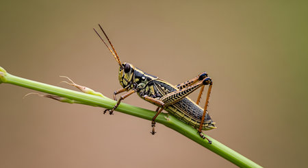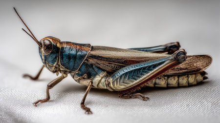 This striking macro photograph captures a grasshopper in detail, revealing its beautiful colors and intricate textures. The soft background enhances the focus on this fascinating insect.
