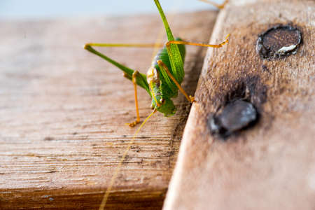 Green bush cricket or long-horned grasshopper licking legs on wooden floor, blur bokeh background with copy space