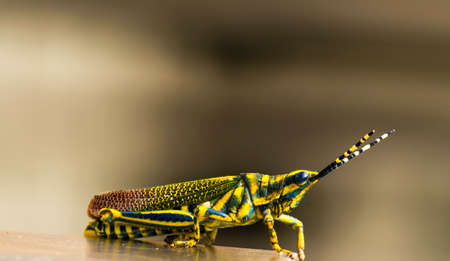 Macro close up of a colorful Mexican grasshopper details, selective focus