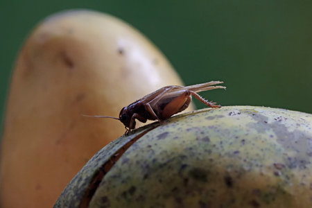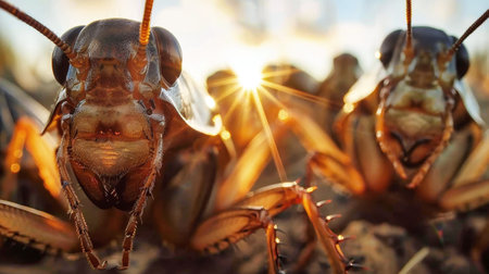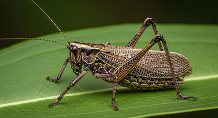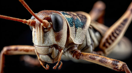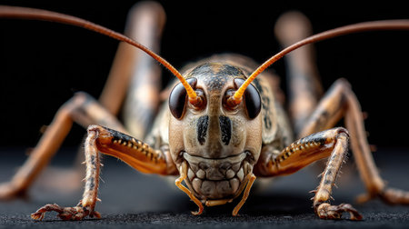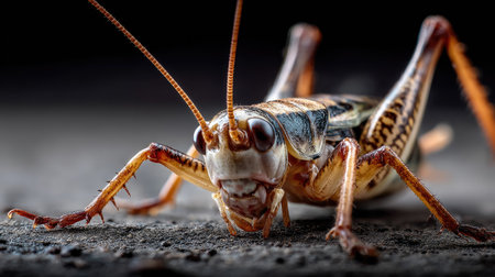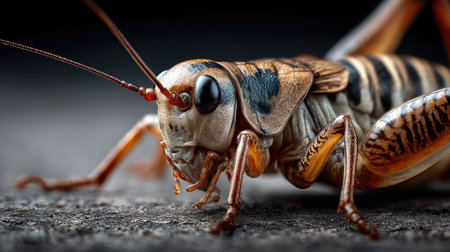A stunning close-up macro image of a cricket showcasing its remarkable details and textures against a dark background. Ideal for nature and insect studies.
