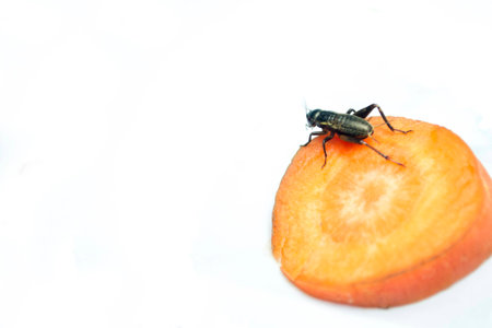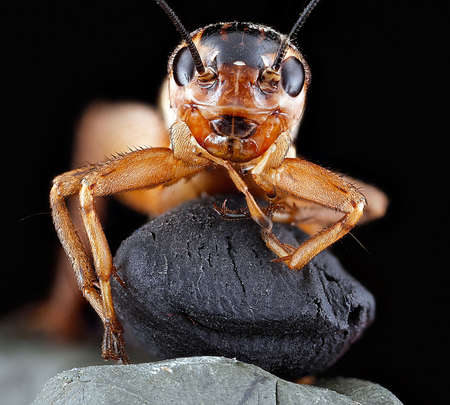 This captivating close-up photograph showcases a cricket, highlighting intricate details and textures of its body, set against a dark background.