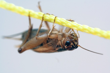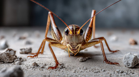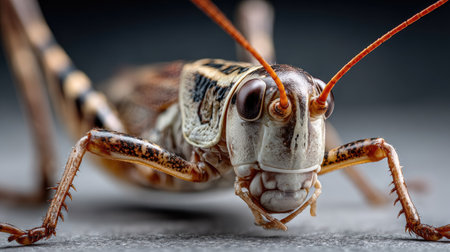This stunning close-up image showcases a cricket with intricate details, highlighting its features and textures against a subtle gray background.