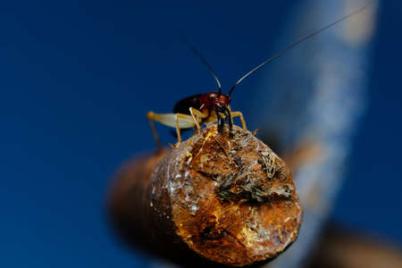 Handsome trig also known as red-headed bush cricket resting on metal rod