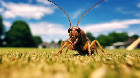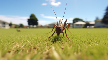 a small grasshopper is seen wandering along a vibrant green lawn, surrounded by houses under a clear blue sky. the photo captures the realistic colors of dark brown and maroon, enhanced by the unique anamorphic lens. this australian landscape is beautifully showcased through the sharp perspective angles, taken with webcam photography, creating a captivating tabletop composition. ai generated