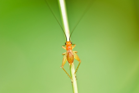 Colombian trig cricket insect, Cyrtoxipha columbiana, on grass leaf, Satara, Maharashtra, India. Family : Gryllidae