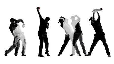 Delayed Arm Action Deceptive Bowling Silhouettes isolated on plain white background.