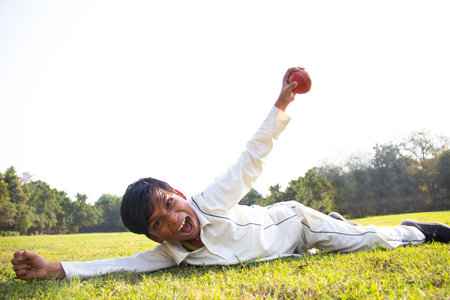 young boy lying on the ground Showing cricket ball