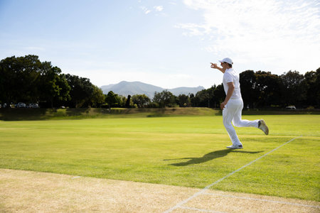 Adult male cricketer sprinting across field in uniform pointing over crease marking, copy space. Athletic, outdoor, sports, movement, landscape, terrain, leisure